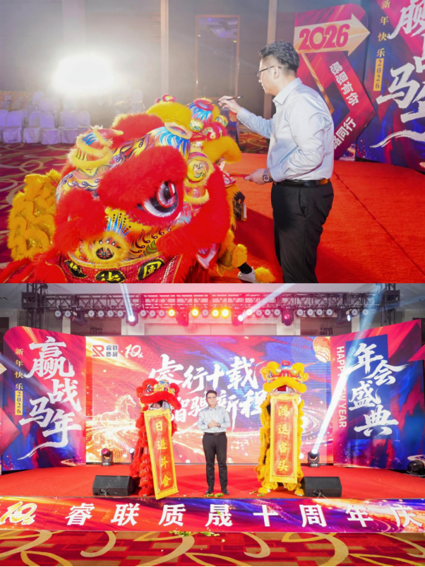 当晚,团圆晚宴在喜庆的舞狮表演中开启,赵总为舞狮点睛、采青,寓意 “遍地生财”,现场氛围热烈祥和。晚宴期间,员工自编自导的诗朗诵、歌曲、歌舞串烧等节目轮番上演,展现了睿联质晟团队的活力与风采。多轮幸运抽奖穿插其中,快马加鞭奖、金马送福奖、马不停蹄奖、龙马精神奖、一马当先奖、马到功成奖等多个奖项陆续送出,惊喜不断。